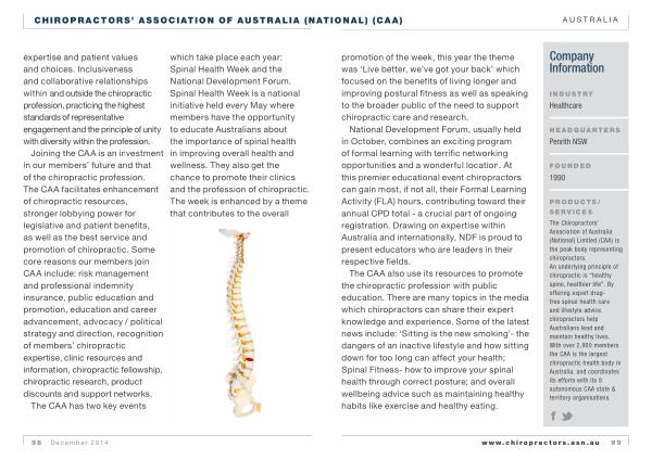The CAA has two key events which take place each year : Spinal Health Week and the National Development Forum . Spinal Health Week is a national initiative held every May where members have the opportunity to educate Australians about the importance of spinal health in improving overall health and wellness . They also get the chance to promote their clinics and the profession of chiropractic . The week is enhanced by a theme that contributes to the overall