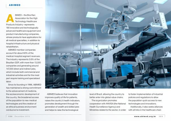 ABIMED – the Brazilian Association for the High Technology Healthcare Products Industry- represents 180 innovative and technologically advanced healthcare equipment and product manufacturing companies , whose products have applications for all medical specialties , in addition to hospital infrastructure and physical rehabilitation .