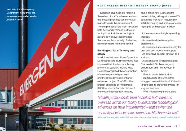 Building out for efficiency and safety In addition to its ambitious Operation Centre program , Hutt Valley DHB has improved its infrastructure through physical expansion . In 2012 Hutt Hospital completed the construction of an emergency department and theatre redevelopment and extension project . The $ 80 million project consisted of two parts : a 3,000 square-meter refurbishment to the existing hospital structure , plus a brand new 6,600 squaremeter building . Along with a new ED containing high-tech features like satellite imaging and ambulatory care , highlights of the project include :