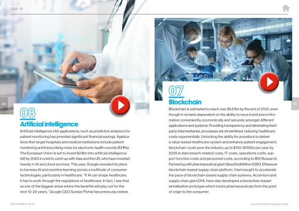 Artificial intelligence ( AI ) applications , such as predictive analytics for patient monitoring has provided significant financial savings . Applications that target hospitals and medical institutions include patient monitoring and transcribing notes for electronic health records ( EHRs ). The European Union is set to invest $ 24bn into artificial intelligence ( AI ) by 2020 in a bid to catch up with Asia and the US , who have invested heavily in AI and cloud services . This year , Google revealed its plans to harness AI and machine learning across a multitude of consumer technologies , particularly in healthcare . “ If AI can shape healthcare , it has to work through the regulations of healthcare . In fact , I see that as one of the biggest areas where the benefits will play out for the next 10-20 years ,” Google CEO Sundar Pichai has previously stated .