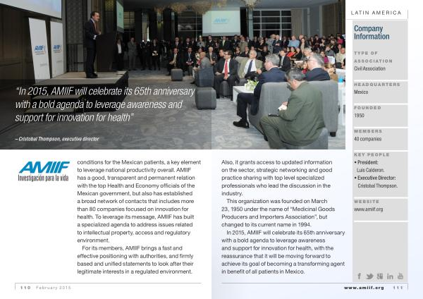 conditions for the Mexican patients , a key element to leverage national productivity overall . AMIIF has a good , transparent and permanent relation with the top Health and Economy officials of the Mexican government , but also has established a broad network of contacts that includes more than 80 companies focused on innovation for health . To leverage its message , AMIIF has built a specialized agenda to address issues related to intellectual property , access and regulatory environment .