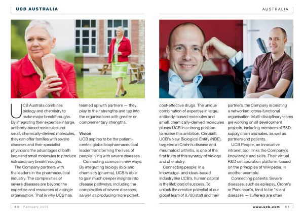 AUSTRALIA cost-effective drugs . The unique combination of expertise in large , antibody-based molecules and small , chemically-derived molecules places UCB in a strong position to realise this ambition . Cimzia ®, UCB ’ s New Biological Entity ( NBE ), targeted at Crohn ’ s disease and rheumatoid arthritis , is one of the first fruits of this synergy of biology and chemistry .