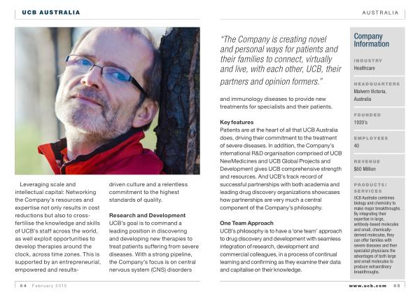 Key features Patients are at the heart of all that UCB Australia does , driving their commitment to the treatment of severe diseases . In addition , the Company ’ s international R & D organisation comprised of UCB NewMedicines and UCB Global Projects and Development gives UCB comprehensive strength and resources . And UCB ’ s track record of successful partnerships with both academia and leading drug discovery organizations showcases how partnerships are very much a central component of the Company ’ s philosophy .