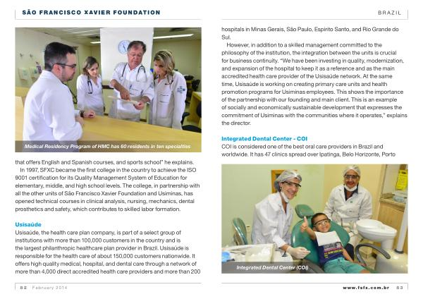 In 1997 , SFXC became the first college in the country to achieve the ISO 9001 certification for its Quality Management System of Education for elementary , middle , and high school levels . The college , in partnership with all the other units of São Francisco Xavier Foundation and Usiminas , has opened technical courses in clinical analysis , nursing , mechanics , dental prosthetics and safety , which contributes to skilled labor formation .