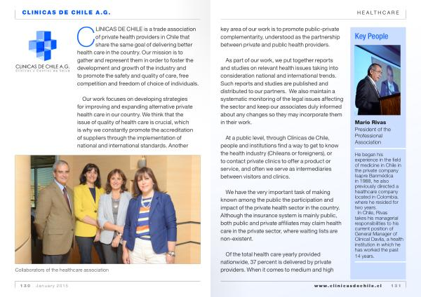 CLINICAS de CHILE is a trade association of private health providers in Chile that share the same goal of delivering better health care in the country . Our mission is to gather and represent them in order to foster the development and growth of the industry and to promote the safety and quality of care , free competition and freedom of choice of individuals .