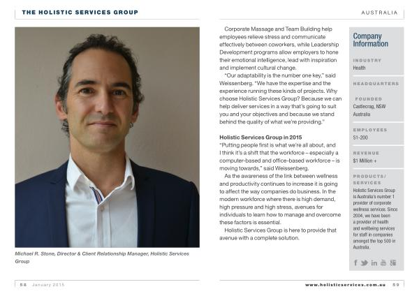 Holistic Services Group is Australia ’ s number 1 provider of corporate wellness services . Since 2004 , we have been a provider of health and wellbeing services for staff in companies amongst the top 500 in Australia . www . holisticservices . com . au 59