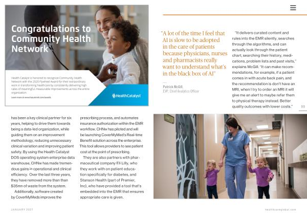 has been a key clinical partner for six years , helping to drive them towards being a data-led organization , while guiding them on an improvement methodology , reducing unnecessary clinical variation and improving patient safety . By using the Health Catalyst DOS operating system enterprise data warehouse , CHNw has made tremendous gains in operational and clinical efficiency . Over the last three years , they have removed more than than $ 35mn of waste from the system . Additionally , software created by CoverMyMeds improves the prescribing process , and automates insurance authorization within the EMR workflow . CHNw has piloted and will be launching CoverMyMed ’ s Real-time Benefit solution across the enterprise . This tool allows providers to see patient cost at the point of prescribing .