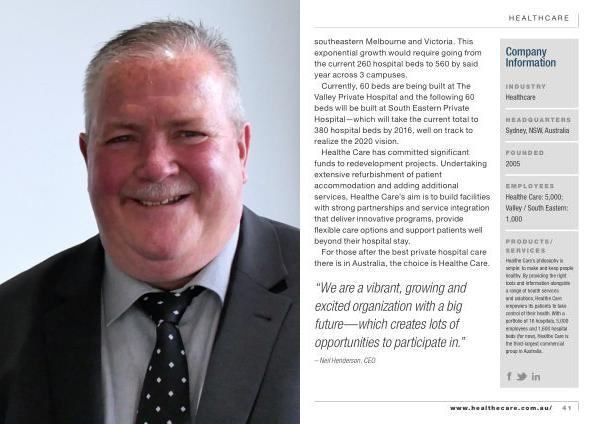PRODUCTS / SERVICES Healthe Care ’ s philosophy is simple : to make and keep people healthy . By providing the right tools and information alongside a range of health services and solutions , Healthe Care empowers its patients to take control of their health . With a portfolio of 16 hospitals , 5,000 employees and 1,600 hospital beds ( for now ), Healthe Care is the third-largest commercial group in Australia .