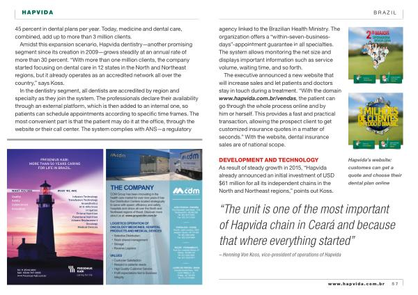 Amidst this expansion scenario , Hapvida dentistry — another promising segment since its creation in 2009 — grows steadily at an annual rate of more than 30 percent . “ With more than one million clients , the company started focusing on dental care in 12 states in the North and Northeast regions , but it already operates as an accredited network all over the country ,” says Koss .