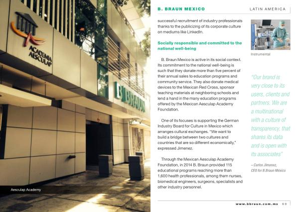 B . Braun Mexico is active in its social context . Its commitment to the national well-being is such that they donate more than five percent of their annual sales to education programs and community service . They also donate medical devices to the Mexican Red Cross , sponsor teaching materials at neighboring schools and lend a hand in the many education programs offered by the Mexican Aesculap Academy Foundation .