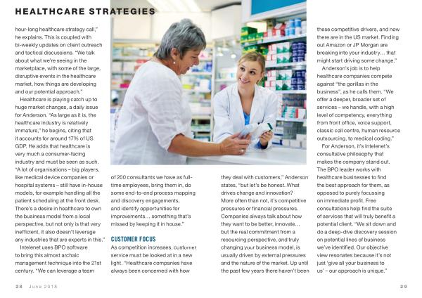 For Anderson , it ’ s Intelenet ’ s consultative philosophy that makes the company stand out . The BPO leader works with healthcare businesses to find the best approach for them , as opposed to purely focussing on immediate profit . Free consultations help find the suite of services that will truly benefit a potential client . “ We sit down and do a deep-dive discovery session on potential lines of business we ’ ve identified . Our objective view resonates because it ’ s not just ‘ give all your business to us ’ – our approach is unique .”