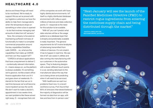 “ CARDS is all about applications that have a requirement to deliver C – contextually relevant information . A – means always on , so the platform is always available . It ’ s something we ’ re good at , not like a back-office finance application that runs 9-5 and goes down at weekends . R – stands for the fact that we run in real time because we ’ ve all become more impatient across the world . We don ’ t want to make a doctor ’ s appointment in two weeks-time , we want problems like these solved right away . D – recognises that a lot of the companies we work with have highly distributed environments . IoT itself is a highly distributed database environment with millions upon millions of devices and data collection points . S – responds to the need for this solution to be scalable .