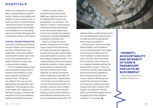 In the long term , where does Shah believe Fakeeh Care is headed in such an evolving space ? “ Our targets this year include making sure our main IT platform is implemented in all our new sites . We ’ ll commence with our primary-care centres and our outpatient hospitals and then the Dubai facility ,” he says . “ This is my main focus . We then want to develop this and provide this capability to other hospital groups who want to use it , either for offshoring or to support the development of their own electronic medical record and hospital information systems . With Yasasii , we would then have the ability to provide this superior service throughout the whole Kingdom of Arabia ,” he concludes .