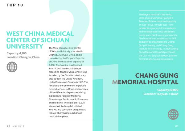 The largest hospital in the world , Chang Gung Memorial Hospital in Taoyuan , Taiwan , has a bed capacity of over 10,000 . It treats over 1.1mn inpatients a year and 3.5mn patients and employs over 5,000 physicians , doctors and healthcare professionals . The hospital was established in 1978 and grew to encompass the Chang Gung University and Chang Gung Institute of Technology . In 2006 Chang Gung Memorial Hospital purchased the Da Vinci Surgical Robotic System for minimally invasive procedures .