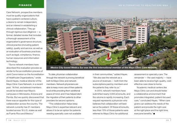 “ Some network members have described this evaluation process as similar to the accreditation process of Joint Commission on the Accreditation of Healthcare Organizations ,” wrote David Hayes , medical director of the Mayo Clinic Care Network , in a recent post . “ At first , we believed members would be located near Mayo ’ s campuses in Minnesota , Arizona and Florida . But we quickly discovered that there was an appetite for this type of collaboration across the country . The network currently has 31 members located across 18 U . S . states as well as Puerto Rico and Mexico .”