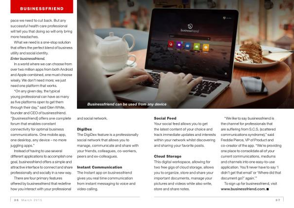“ On any given day , the typical young professional can have as many as five platforms open to get them through their day ,” said Glen White , founder and CEO of businessfriend . “[ businessfriend ] offers one complete forum that enables constant connectivity for optimal business communications . One mobile app , one desktop , any device – no more juggling apps .”