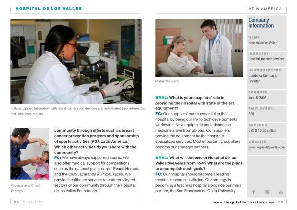Physical and Chest Therapy community through efforts such as breast cancer prevention program and sponsorship of sports activities ( PGA Latin America .) Which other activities do you share with the community ? FC : We have always supported sports . We also offer medical support for competitions such as the national police corps ’ Peace Heroes , and the Club Jacaranda ATP 250 , races . We provide healthcare services to underprivileged sectors of our community through the Hospital de los Valles Foundation .