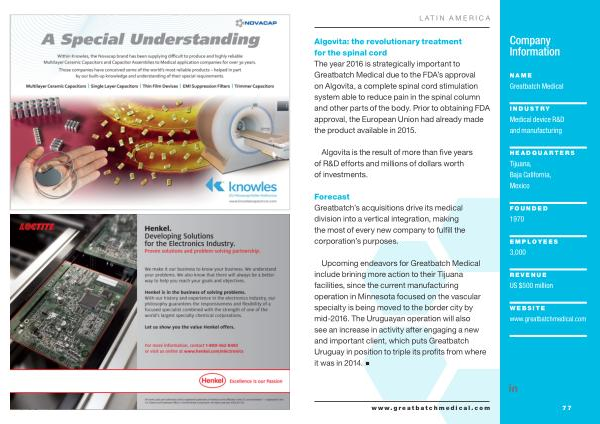 Upcoming endeavors for Greatbatch Medical include brining more action to their Tijuana facilities , since the current manufacturing operation in Minnesota focused on the vascular specialty is being moved to the border city by mid-2016 . The Uruguayan operation will also see an increase in activity after engaging a new and important client , which puts Greatbatch Uruguay in position to triple its profits from where it was in 2014 .