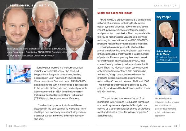Sanchez has worked in the pharmaceutical industry for nearly 30 years . She has held key positions for global companies , leading operations in Latin America , the Caribbean , Canada and Asia . She welcomed PROBIOMED as a challenge to turn it into Mexico ’ s contribution to the world in biotech-derived medical products . Sanchez earned an MBA from the Monterrey Institute of Technology and Higher Education ( ITESM ) and other executive certifications .