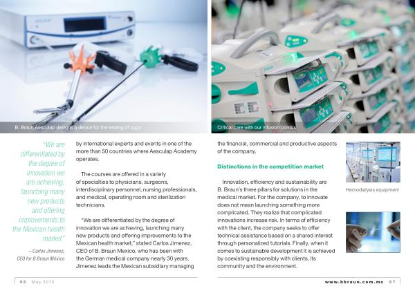 “ We are differentiated by the degree of innovation we are achieving , launching many new products and offering improvements to the Mexican health market ,” stated Carlos Jimenez , CEO of B . Braun Mexico , who has been with the German medical company nearly 30 years . Jimenez leads the Mexican subsidiary managing