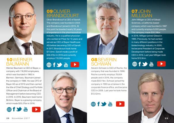 Oliver Brandicourt is CEO of Sanofi . The company was founded in 2004 and Brandicourt joined in 2015 . At this point he boasted nearly 30 years of experience in the pharmaceutical industry . He is a qualified physician who worked at Pfizer for 13 years and served as CEO of Bayer Healthcare AG before becoming CEO of Sanofi . In 2017 , Brandicourt took home $ 11.6mn . Sanofi made a profit of $ 36.57bn in 2016 and currently employs 110,000 people . 28 November 2017
