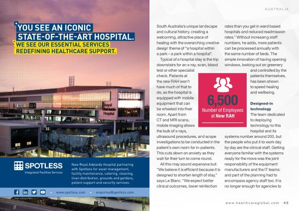 New Royal Adelaide Hospital partnering with Spotless for asset management , facility maintenance , catering , cleaning , linen distribution , grounds and gardens , patient support and security services .