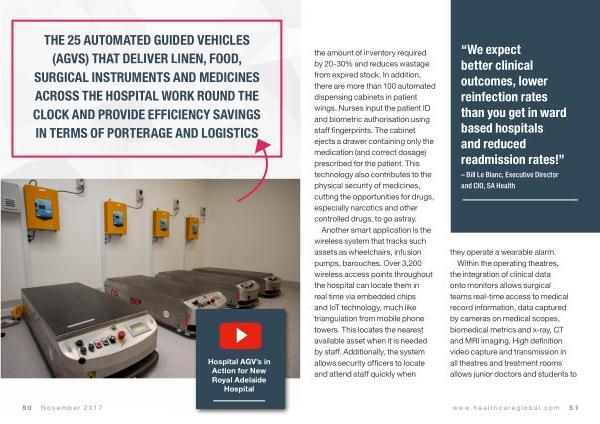 THE 25 AUTOMATED GUIDED VEHICLES ( AGVS ) THAT DELIVER LINEN , FOOD , SURGICAL INSTRUMENTS AND MEDICINES ACROSS THE HOSPITAL WORK ROUND THE CLOCK AND PROVIDE EFFICIENCY SAVINGS IN TERMS OF PORTERAGE AND LOGISTICS Hospital AGV ’ s in Action for New Royal Adelaide Hospital