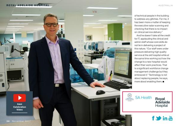 And he doesn ’ t take all the credit for IT , applauding the clinical and admin staff whose core skills do not lie in delivering a project of this nature . “ Our staff were under pressure delivering high quality service at the old hospital while at the same time working out how the change to a new hospital would affect their work practices . That is a significant workforce change management challenge but they embraced it .” Technology is not about replacing people , he says , more about enabling them .