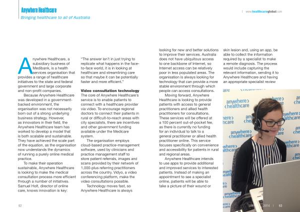 Video consultation technology The core of Anywhere Healthcare ’ s service is to enable patients to connect with a healthcare provider via video . To encourage regional doctors to connect their patients in rural or difficult-to-reach areas with city specialists , there are incentives and other government funding available under the Medicare system .