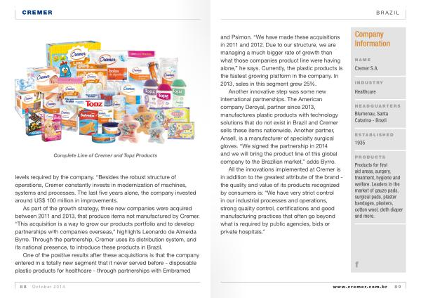 Another innovative step was some new international partnerships . The American company Deroyal , partner since 2013 , manufactures plastic products with technology solutions that do not exist in Brazil and Cremer sells these items nationwide . Another partner , Ansell , is a manufacturer of specialty surgical gloves . “ We signed the partnership in 2014 and we will bring the product line of this global company to the Brazilian market ,” adds Byrro .