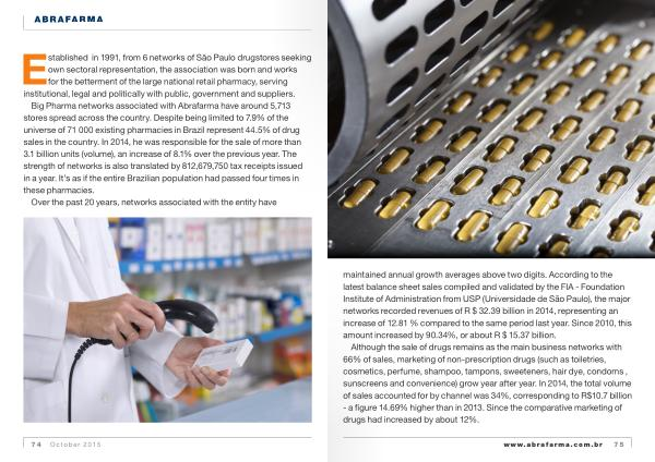 Big Pharma networks associated with Abrafarma have around 5,713 stores spread across the country . Despite being limited to 7.9 % of the universe of 71 000 existing pharmacies in Brazil represent 44.5 % of drug sales in the country . In 2014 , he was responsible for the sale of more than 3.1 billion units ( volume ), an increase of 8.1 % over the previous year . The strength of networks is also translated by 812,679,750 tax receipts issued in a year . It ’ s as if the entire Brazilian population had passed four times in these pharmacies . Over the past 20 years , networks associated with the entity have