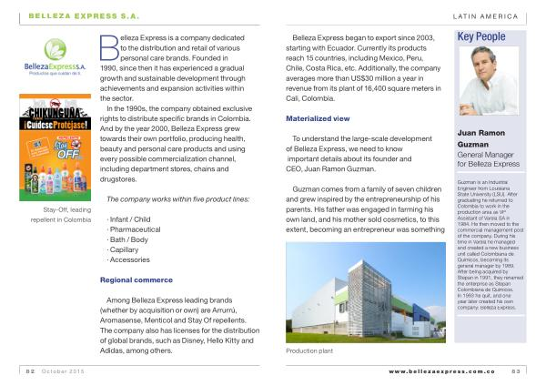 Belleza Express began to export since 2003 , starting with Ecuador . Currently its products reach 15 countries , including Mexico , Peru , Chile , Costa Rica , etc . Additionally , the company averages more than US $ 30 million a year in revenue from its plant of 16,400 square meters in Cali , Colombia .