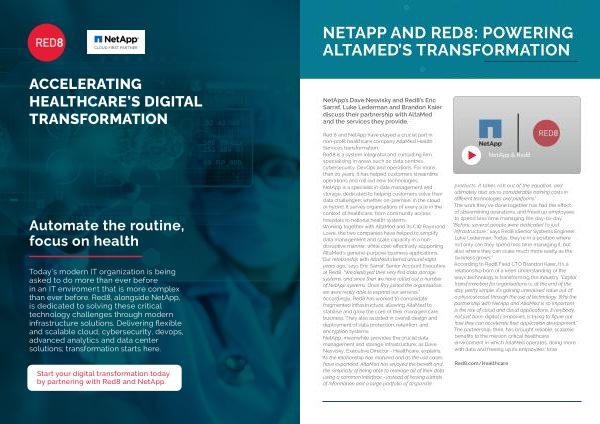 Red 8 and NetApp have played a crucial part in non-profit healthcare company AltaMed Health Services transformation . Red8 is a system integrator and consulting firm , specialising in areas such as data centres , cybersecurity , DevOps and operations . For more than 20 years , it has helped customers streamline operations and roll out new technologies . NetApp is a specialist in data management and storage , dedicated to helping customers solve their data challengers whether on-premise , in the cloud or hybrid . It serves organisations of every size in the context of healthcare , from community access hospitals to national health systems . Working together with AltaMed and its CIO Raymond Lowe , the two companies have helped to simplify data management and scale capacity in a nondisruptive manner , while cost-effectively supporting AltaMed ’ s general-purpose business applications . “ Our relationship with AltaMed started around eight years ago ,” says Eric Sarraf , Senior Account Executive at Red8 . “ We deployed their very first data storage systems , and since then we have rolled out a number of NetApp systems . Once Ray joined the organisation , we were really able to expand our services .” Accordingly , Red8 has worked to consolidate fragmented infrastructure , allowing AltaMed to stabilise and grow the core of their managed care business . They also assisted in overall design and deployment of data protection , retention , and encryption systems . NetApp , meanwhile , provides the crucial data management and storage infrastructure , as Dave Nesvisky , Executive Director - Healthcare , explains : “ As the relationship has matured and as the use cases have expanded , AltaMed has enjoyed the benefit and the simplicity of being able to manage all of their data using a common interface - instead of having islands of information and a large portfolio of disparate products . It takes risk out of the equation , and ultimately also saves considerable training costs in different technologies and platforms .” The work they ’ ve done together has had the effect of streamlining operations , and freed up employees to spend less time managing the day-to-day . “ Before , several people were dedicated to just infrastructure ,” says Red8 ’ sSenior Systems Engineer , Luke Lederman . Today , they ’ re in a position where not only can they spend less time managing it , but also where they can scale much more easily as the business grows .” According to Red8 Field CTO Brandon Kaier , It ’ s a relationship born of a keen understanding of the ways technology is transforming the industry . “ Digital transformation for organisations is , at the end of the day , pretty simple . It ’ s gaining unrealised value out of a physical asset through the use of technology . Why the partnership with NetApp and AltaMed is so important is the rise of cloud and cloud applications . Everybody , not just born-digital companies , is trying to figure out how they can accelerate their application development .” The partnership , then , has brought reliable , scalable benefits to the mission critical healthcare environment in which AltaMed operates , doing more with data and freeing up its employees ’ time .