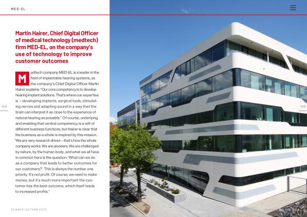 M edtech company MED-EL is a leader in the field of implantable hearing systems , as the company ’ s Chief Digital Officer Martin Hairer explains : “ Our core competency is to develop hearing implant solutions . That ’ s where our expertise is – developing implants , surgical tools , stimulating nerves and adapting sound in a way that the brain can interpret it as close to the experience of natural hearing as possible .” Of course , underlying and enabling that central competency is a raft of different business functions , but Hairer is clear that the business as a whole is inspired by this mission . “ We are very research driven – that ’ s how the whole company works . We are pioneers . We are challenged by nature , by the human body , and what we all have in common here is the question : ‘ What can we do as a company that leads to better outcomes for our customers ?’. This is always the number one priority . It ’ s not profit . Of course , we need to make money , but it ’ s much more important the customer has the best outcome , which itself leads to increased profits .”